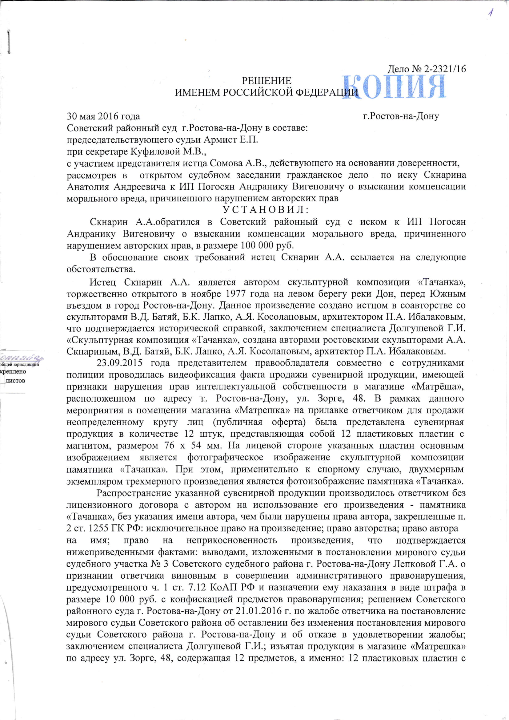 Так, в настоящее время нами наработана уникальная практика защиты интеллектуальных прав на объекты скульптуры, исключительные права на которые принадлежат таким известным скульпторам, как С.Н. Олешня, А.А. Скнарин, Д.В. Лындин. В пользу названных правообладателей с нарушителей взысканы значительные компенсации (с текстами судебных актов можно ознакомиться в разделе «Выигранные дела».